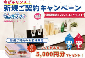ウォーターサーバーご契約されるなら今がチャンス!!「新規ご契約キャンペーン」2026年2月28(土)まで★オークス商品券 最大5,000円分プレゼント中★※契約プランによって商品券の受取枚数に変動がございます。※詳しくはスタッフまでご確認下さいませ!新規会員様限定のキャンペーンです♪2026年2月28(土)までにピュールサーバーに新規のご契約とさせて頂いたお客様とさせてい...